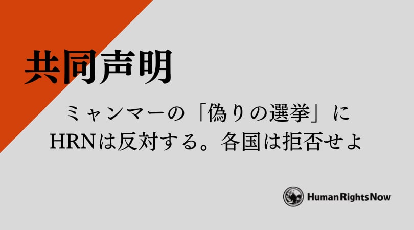ヒューマンライツ・ナウは、ミャンマー軍が違法な支配を「正当化」するための「偽りの総選挙」に抗議する声明を公表しました。 声明のダウンロードはこちら〈英語〉〈日本語〉