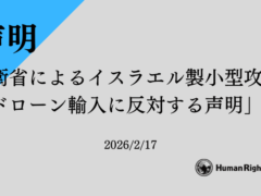 ヒューマンライツ・ナウは、防衛省によるイスラエル製小型攻撃ドローンの輸入に反対し、日本政府に対して、今後、IAIを含むイスラエル軍需企業との一切の取引及びその検討の中止を求める声明を公表しました。 ◇ダウンロードはこちら …